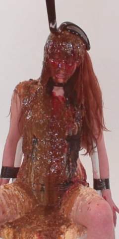 Stacey got lowered into a big vat of warm chocolate pudding by flexmess